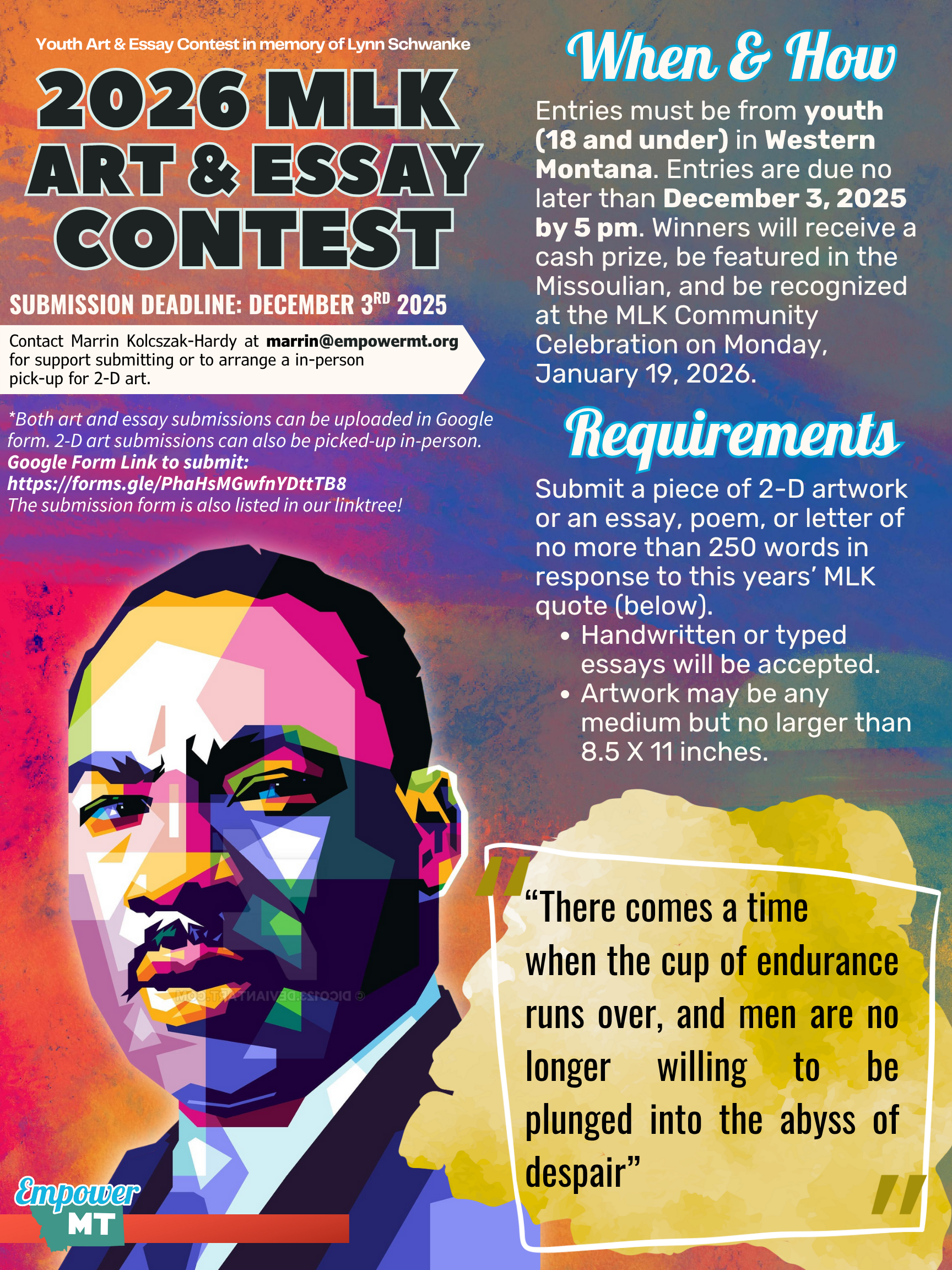 The event will bring together local racial justice leaders, youth voices, and community artists in a powerful demonstration of unity and purpose. Featured elements include our annual Youth Art & Essay Contest, musical performances by local artists, and inspiring calls to action from youth leaders.